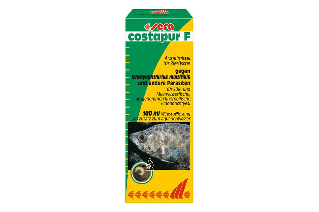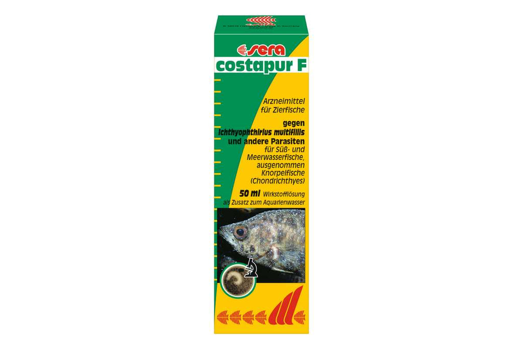 sera costapur F ist ein klassisches Arzneimittel für Süß- und Meerwasserfische gegen Ichthyophthirius multifiliis und andere einzellige Hautparasiten, wie z. B. Ichthyobodo necator, Chilodonella, Trichodina, Brooklynella und Cryptocaryon irritans (letztere im Meerwasser). Weiterhin wirkt es effektiv gegen Verpilzungen (Mykosen).