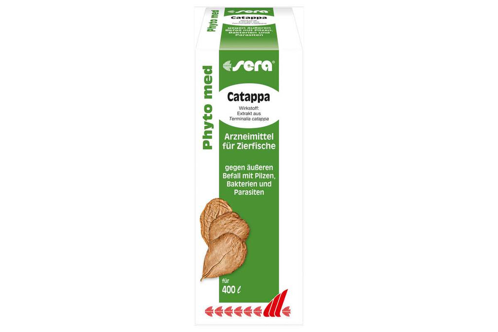 Das pflanzliche Arzneimittel sera Phyto med Catappa enthält als Wirkstoff einen Extrakt aus Seemandelbaumblättern (Terminalia catappa) gegen Pilze, Bakterien und Ektoparasiten. Es ist das erste Medikament für die Aquaristik auf Basis von Catappablättern. Durch das neue, einzigartige von sera entwickelte Extraktionsverfahren wird das Maximum der medizinisch wirksamen Substanzen aus den Blättern gelöst. sera Phyto med Catappa wirkt durch den speziellen Wirkstoffvermittler schneller. Im Vergleich mit normalen Extrakten oder der reinen Zugabe von Catappablättern wirkt sera Phyto med Catappa bis zu 10 Mal stärker.